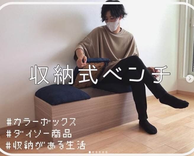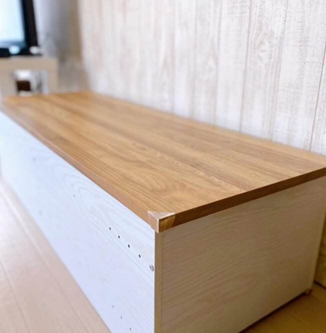 こちらは使わなくなった古いカラーボックスでつくった収納式ベンチ。全体にリメイクシートを貼って雰囲気を一新。天板部分には綿をしいて布で覆いかぶせることで座り心地も抜群のベンチが完成です!