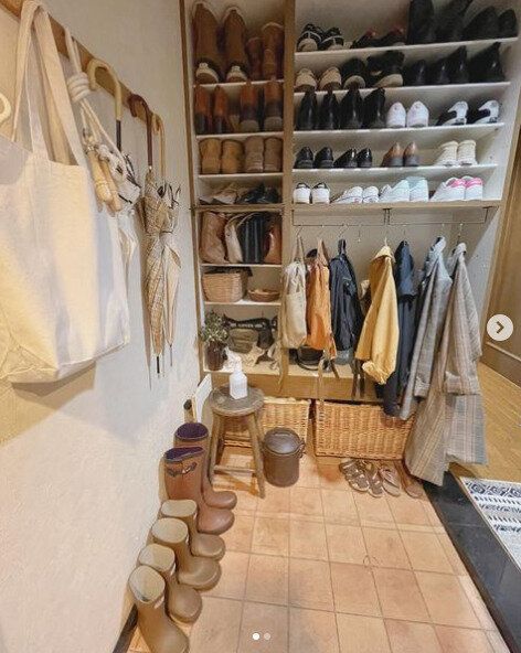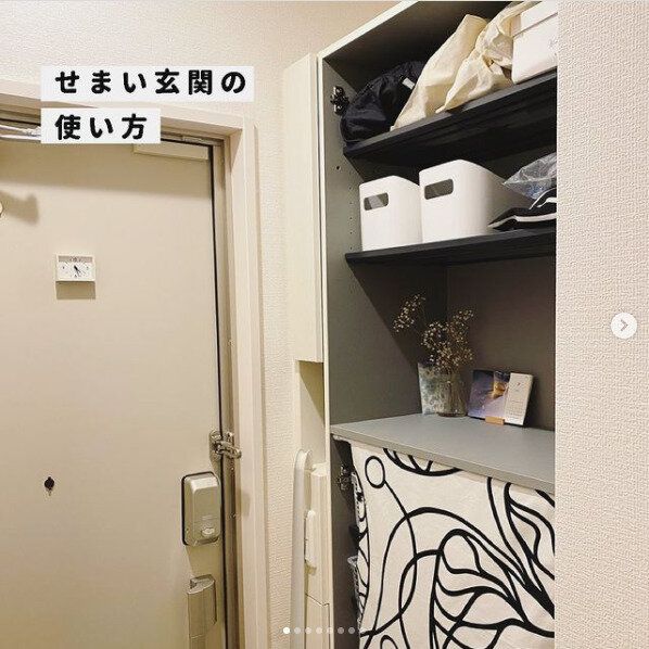 靴箱がないため、見せる収納とクローゼット収納とで分けてしまっているそうです。見せる収納とインテリアとの統一感もあり、おしゃれ!必要なものを必要なぶんだけ取り出せるので、玄関まわりをきれいに保ちやすくなりそうです。