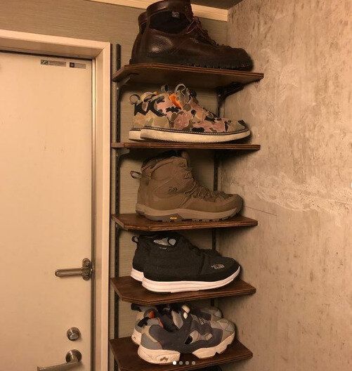 こちらは玄関の靴収納のスペースをDIYした例です。レールと棚受けを取りつけ、収納スペースを作成。オープンな収納なので、カビなども発生しにくく衛生的ですね。