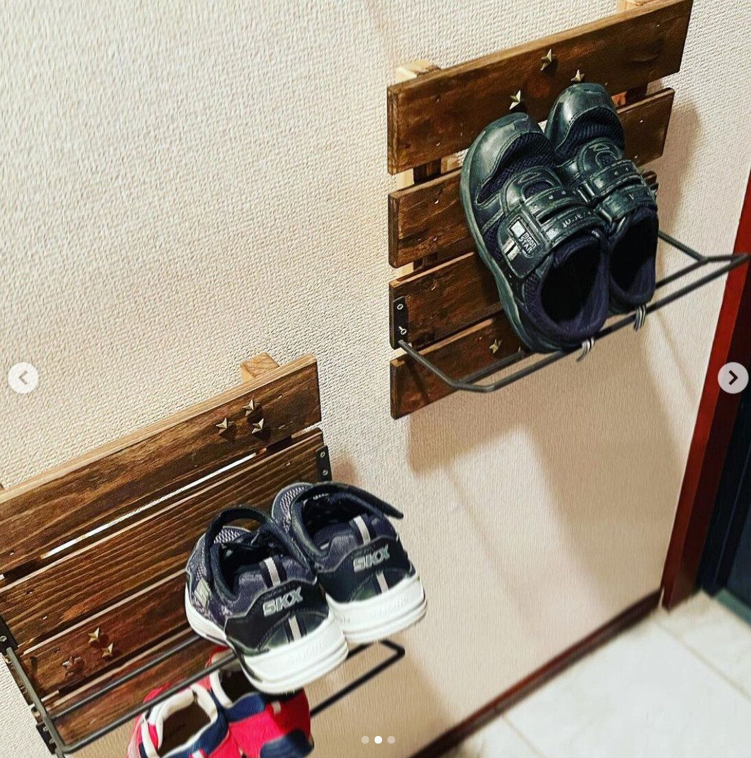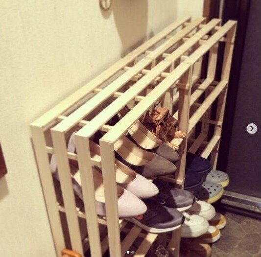 靴収納のスペースがなくなってきたら、DIYすることも可能です。こちらは100均で材料をそろえ、500円でつくった靴収納。とても安く靴収納をつくることができますね。