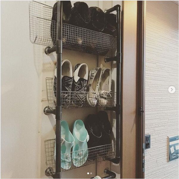 DIYでつくったという男前なシューズラックは、すべて100均のアイテムを使っているそうです。素材やカラーを統一することで、ごちゃごちゃせず、スッキリ整った印象になります。
