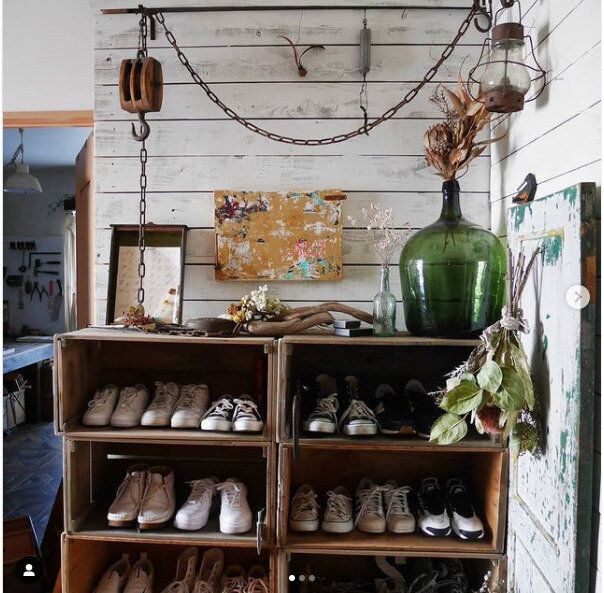 りんご箱を積み重ねるだけで大容量でおしゃれな靴収納棚が簡単にできちゃいます。雰囲気もまるでアトリエのような印象で見せる収納としても大活躍します。りんご箱やワイン箱などは専用の靴収納棚を購入するよりもお手ごろ価格で手に入りやすいのも魅力です。