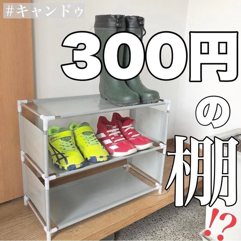 キャンドゥでは330円で購入できるシューズラックがあります。こちらは組み立てないといけないですが、組み立て方は簡単なので女性でもラクラク。お値段のわりに丈夫なつくりになっているので、もう少し靴収納が欲しいときなどにとっても便利です。
