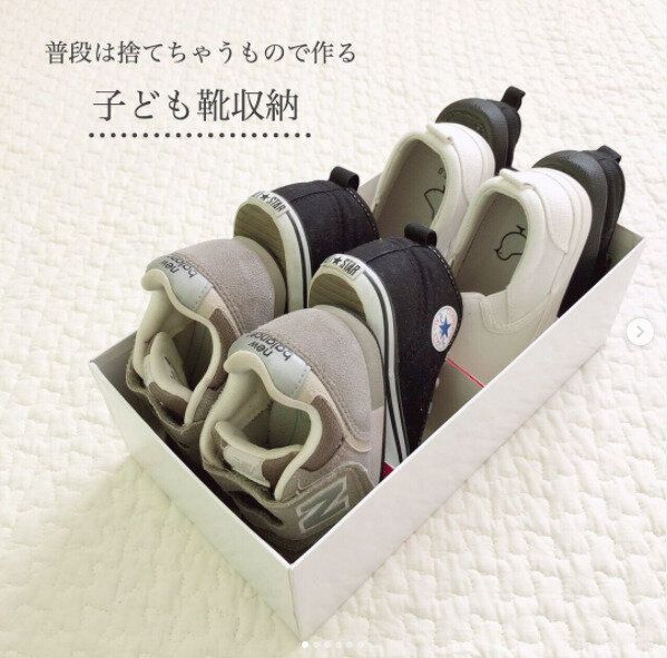どんどん増えがちな子どもの靴は空き箱と牛乳パックを使った収納ボックスを活用すればたくさん収納することができます。わざわざ収納ボックスを購入する必要がなく、不要になれば簡単に捨てられるので便利です。