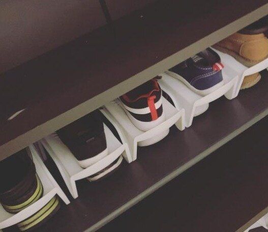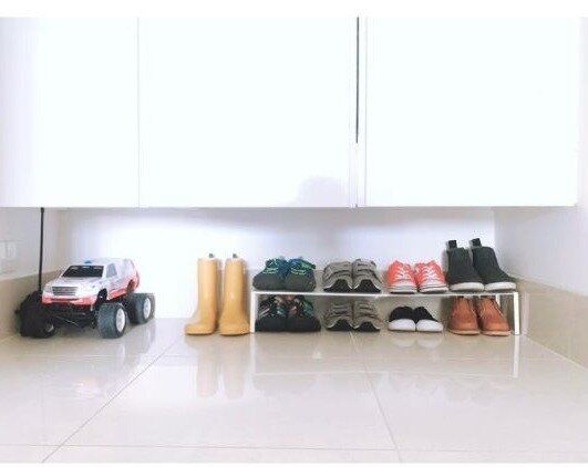 たくさんある靴はシューズラックを使って2段に収納するのがおすすめです。幅も調整できるラックはどんな幅の靴箱にもフィットし、スペースを有効活用します。このシューズラックを使えば、今の2倍靴が収納できるかもしれませんね。