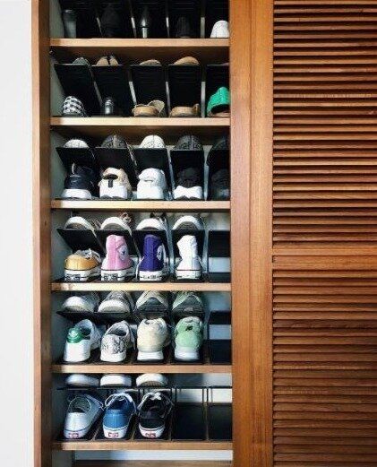 コンパクトで美しい靴収納のアイデアです。スニーカーは、片足ずつ逆にして収納力を上げているそう。色や素材ごとのまとまりも感じられて、よりスッキリ見えます。
