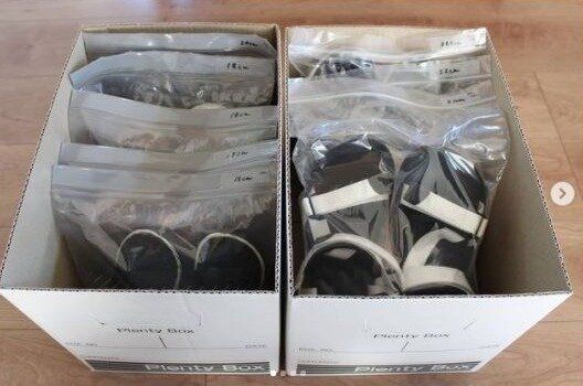 すぐにサイズアウトしてしまう子どもの靴はお下がりとして保管しておく人も多いはず。そんなときは一足ずつ袋に収納し、サイズを書いてボックス内に立てて収納しておくことで省スペースできれいに保管しておくことができます。