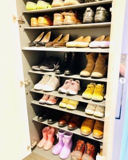 人別の靴収納アイデアです。このように段ごとに分けると、一目で場所がわかりやすく、靴の状態も確認しやすくなりそうです。入るぶんだけの靴を厳選するので、見た目はすっきりとして、買いすぎ防止にもつながりそうですね。