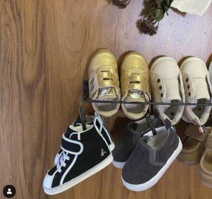 ダイソーのディッシュラックを靴棚にひっかけて、靴収納として活用したアイデアです。赤ちゃんの靴は、飾ってもかわいいので、サイズアウトしたけど捨てられないファーストシューズ収納としてもオススメです。