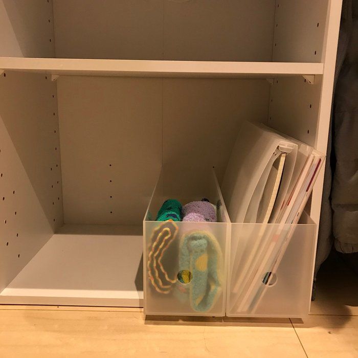 散らかった学用品は、まずは使う頻度別にわけるのがいいと、サンキュ!STYLEライターのマツさんはいいます。分別したあとは、収納棚にフックを取りつけて「かける収納」をつくるのがオススメなのだとか。プリントや細かいものはボックスに収納することで見栄えもすっきりするようですよ。