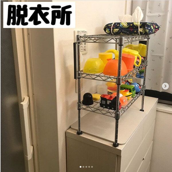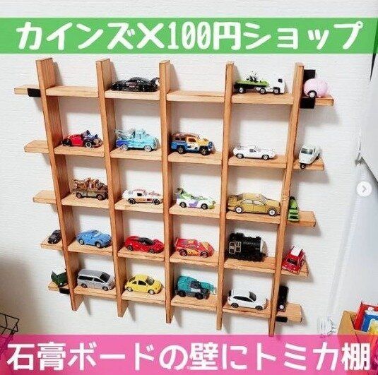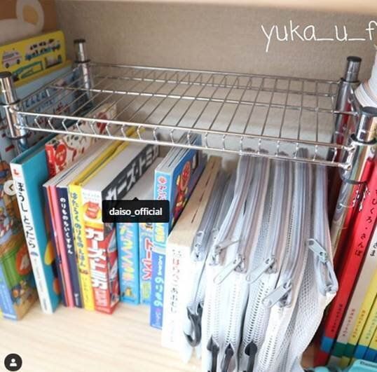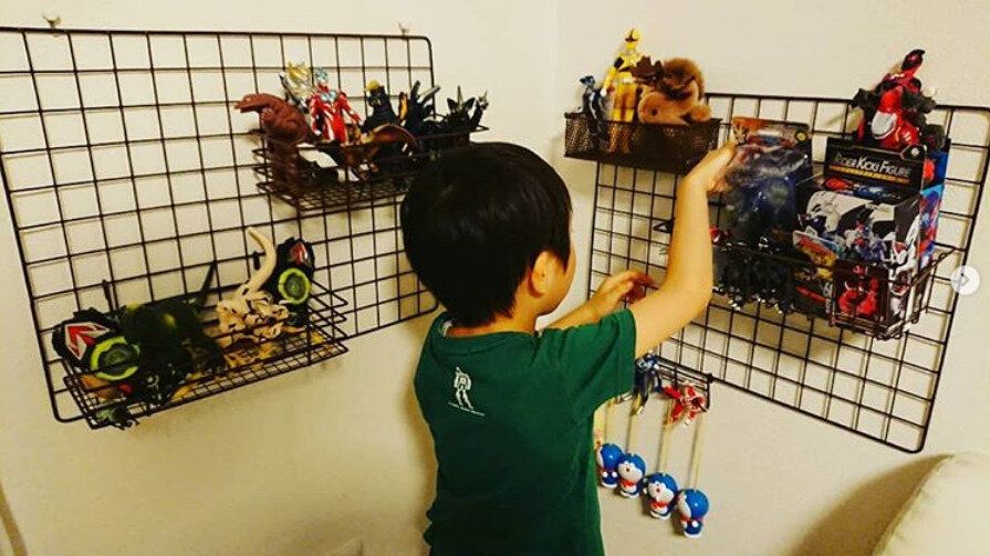 ワイヤーラティスにワイヤーラックやフックを取りつけた簡単にできる収納ラック。材料がすべて100均でそろうので、必要なぶんだけ自由にカスタマイズできる手軽さも大きな魅力です。お気に入りのおもちゃをディスプレイのように飾れるので、子どもの片づけ意欲も高まりそうですね。