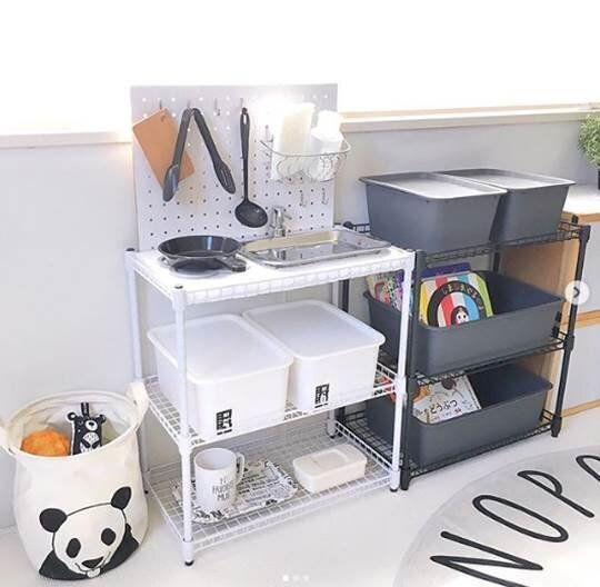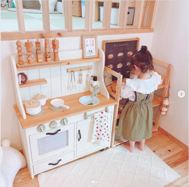 ままごとキッチンの高さとラックの上段の高さをそろえれば収納スペース兼おままごとの作業台としても使えるのでとっても便利。おままごとのおもちゃをそのまま置きっぱなしにしても収納スペースなので部屋が散らかることもなくお片づけの手間も減ります。