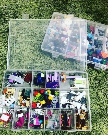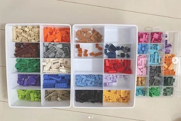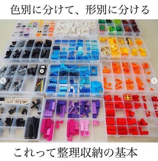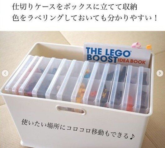 小さな子どもたちにとって、大量のブロックからお目当てのパーツを探しだすのはたいへんで、「ママ~」なんて呼ばれることも。こちらはダイソーの「仕切り収納ボックス」で色別にパーツを収納したアイデア。小さな子どもでもこれなら探しやすいですよね。「仕切り収納ボックス」はふたつきなので便利。こちらは300円商品です。