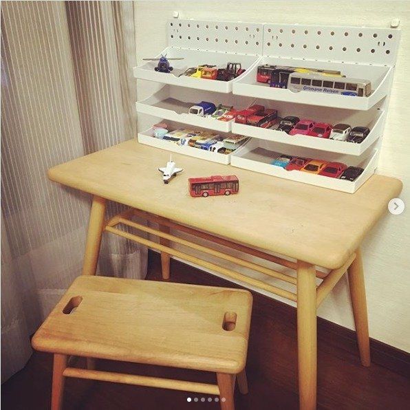 ダイソーで販売されているパンチングボードを使えば、お手軽におもちゃの壁面収納が可能になります。お子さんのテーブル上に設置しておけば、テーブルの上で遊んだあとも簡単にお片づけが可能になります。