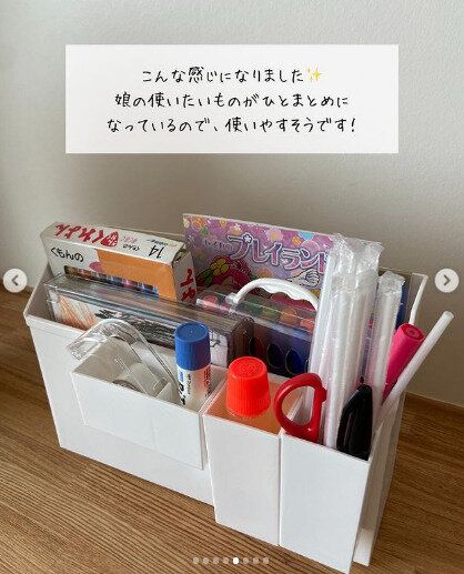 こちらは工作が大好きな娘さんのためにつくった「工作セット」。セリアの「メイルボックス」に「ファイルボックスポケット」を組みあわせてつくった力作です。どこに何があるかわかりやすくしまいやすいのもいいですね。これはマネしてみたい!