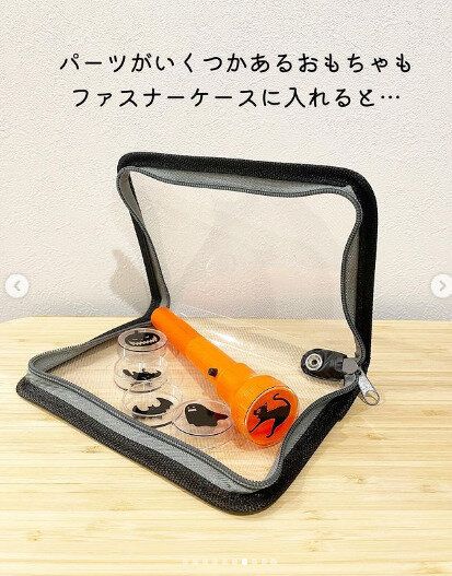 パーツがいろいろついているおもちゃ。こちらは、ひとまとめにして収納しておくアイデアです。セリアの「ファスナーケース(A6サイズ)」を使って収納すれば、何が入っているのかも見やすく便利。使った後は必ずここへ!これだけを子どもに徹底しておけば、紛失したときのめんどうさから解放されます!