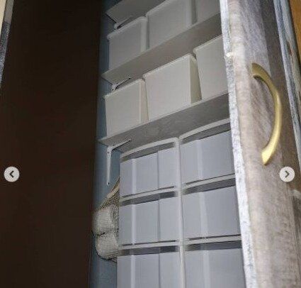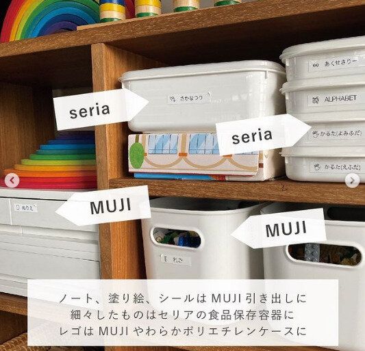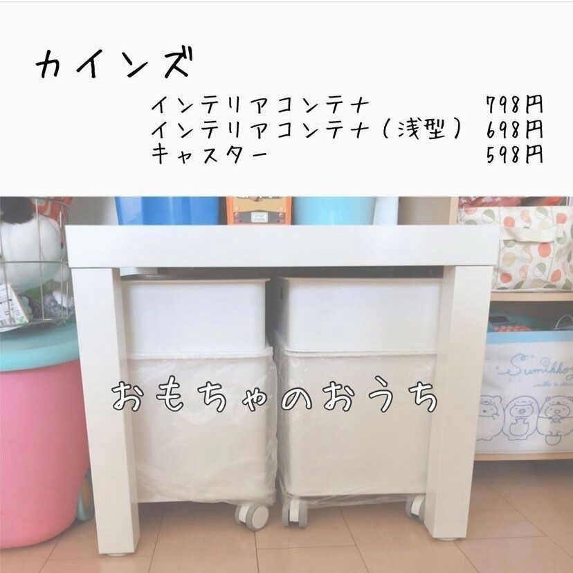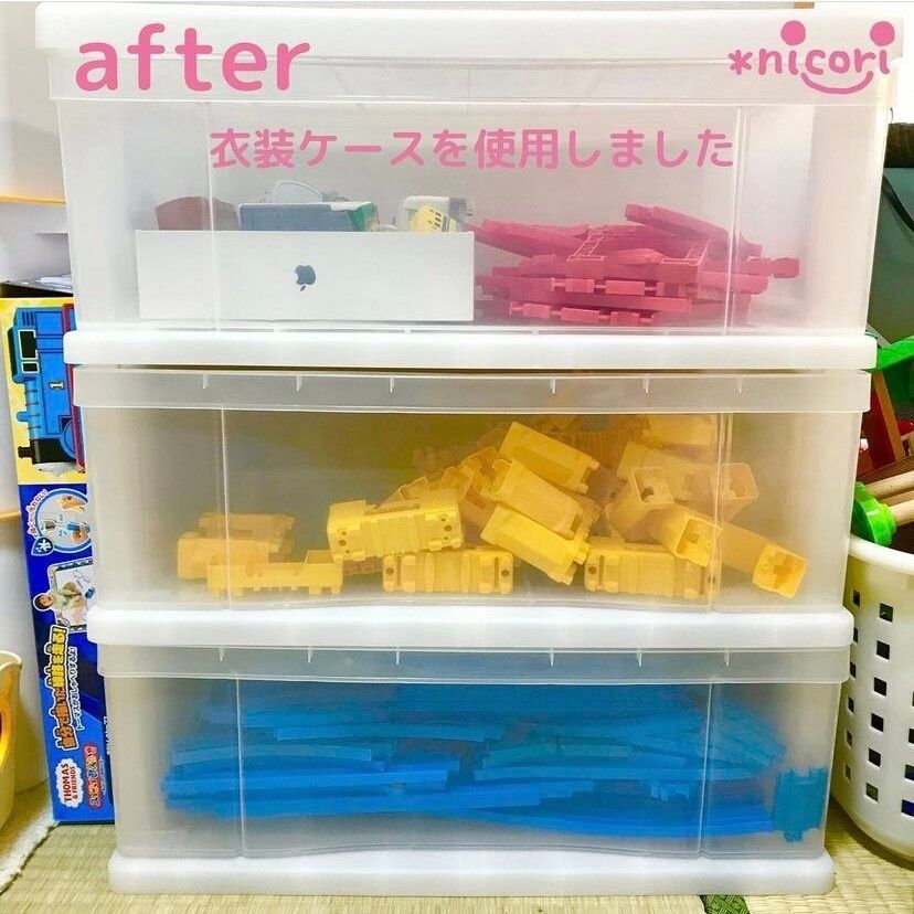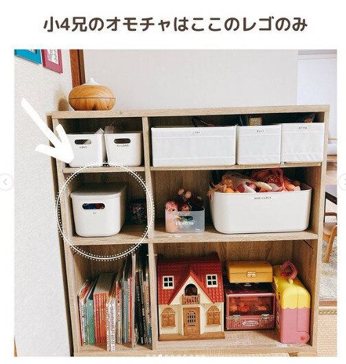 男の子と女の子の兄妹だとおもちゃの数も種類も増えがち。こちらはセリアなどの収納ケースを使っておもちゃを全部まとめて収納したアイデアです。セリアならサイズもいろいろとそろうから、収納棚の中でシンデレラフィットも可能ですよね。