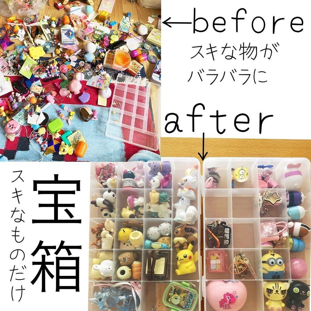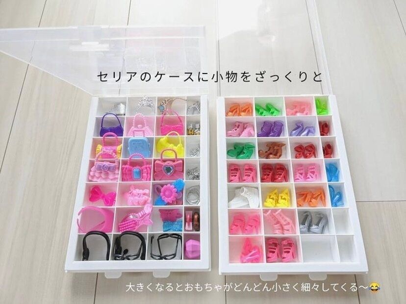 女の子のおもちゃは、年齢が上がるにつれ細々した物が増えますよね。ざっくりとした収納ケースにしまってしまうと、すぐになくなってしまいます。そんな小さなおもちゃも簡単に収納できるのがセリアの小物ケース。探す手間も省け、見ているだけで微笑むようなかわいい収納方法です。