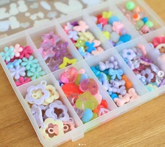 ビーズアクセサリーをつくるときのパーツ収納には、セリアの仕切りつきケース「SIKIRI」がおすすめ!こちらは、10個に仕切りが分かれた「SIKIRI10」です。色ごとに分けたり、種類で分けたりと使い方は自由。カチッとしまるふたもついているので、こんなに小さなビーズが入っていても、立てて収納することも可能です。