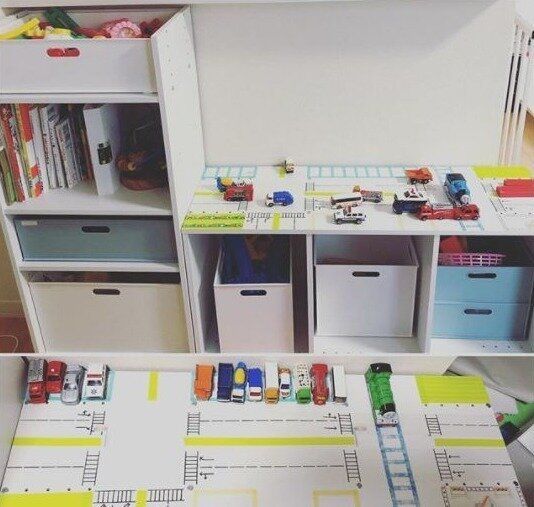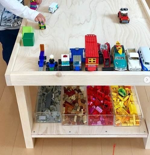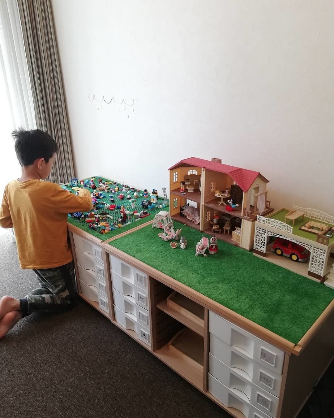 収納ケースの上のスペースも、ぬいぐるみや大きめのおもちゃをのせがちですが、思いきって遊び場にしてしまうのもアリ!遊ぶのにスペースを取るブロック玩具も、ここを遊び場兼収納場所にすれば、散らからずに遊べます。作品をそのまま残して飾っておけるのもいいですね。