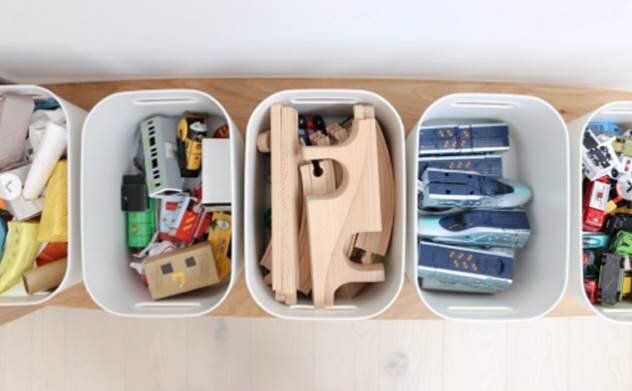 子どもにとって、同じ色で統一した箱やこまかい引き出しのある箱は違いを覚えるのがたいへん。でも3つに分類されている箱ならストレスなく違いを覚えられるんです。箱の分け方を見直して、片づけハードルを下げましょう。