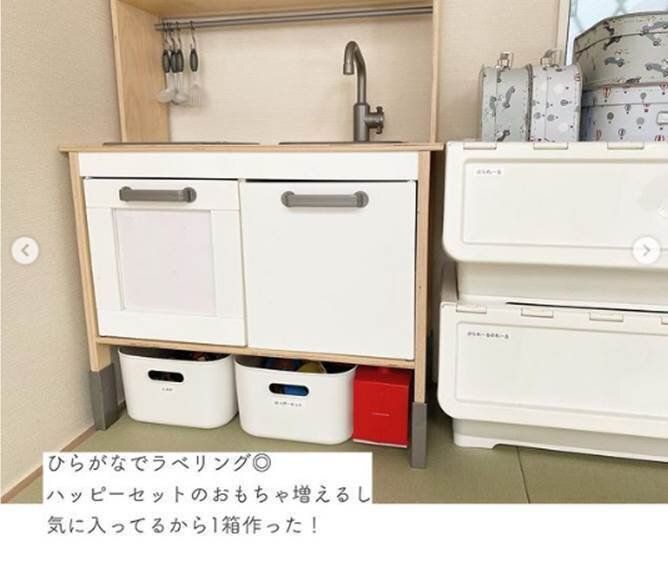 このおもちゃ収納、じつは子どもが遊びながら片づけられる工夫がされているんです。それぞれのボックスに入っているおもちゃの写真を撮り、ボックスの内側へ貼りつけます。