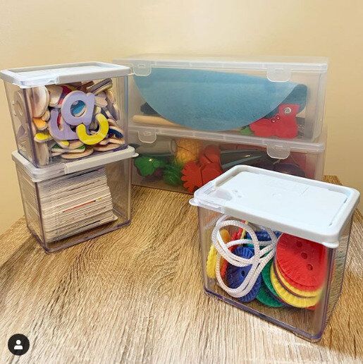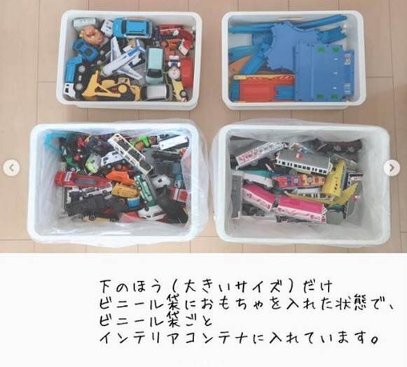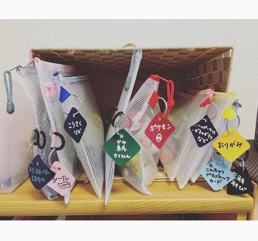 管理しにくいこまごまとしたおもちゃを、ジッパーつきポリ袋に小分けにし、中身がわかりやすいようタグをつけたアイデア。袋を縦置きにすることで使いたいものが取り出しやすく、遊び終わったら袋にサッと入れるだけでOKなので片づけのハードルをぐっと下げることができそうです。