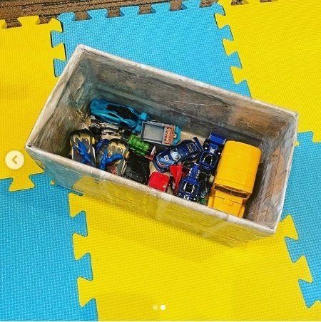 箱にしまっているおもちゃを撮影してプリントし、底面にペタリ。片づけタイムに「おもちゃを正しいおうちにもどそう!」と声がけすれば、しまうのもゲームになります。