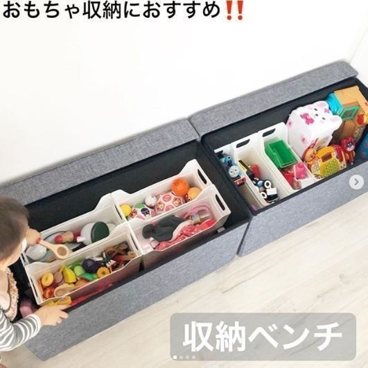 子どものおもちゃを収納できるのは棚だけじゃありません。ふだん座っているベンチも、収納可能なものにすれば、スペースを有効に使うことができますよ。ベンチなら、子どもの背の高さでも開け閉めができ、自分でおもちゃを出し入れすることができますね。お部屋の見た目もすっきりするのでおすすめです。