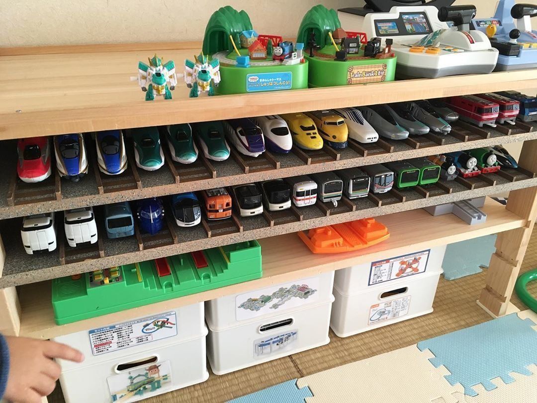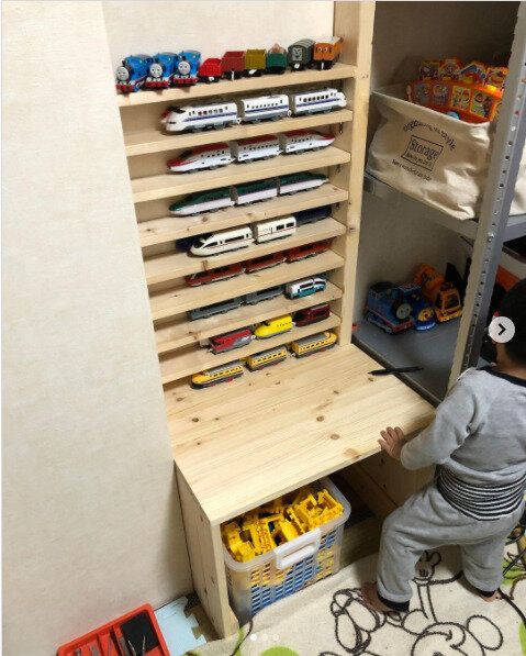 こちらはパパがDIYしたというプラレール専用の見せる収納ラックです。これならお子さんも自らお片づけしたくなること間違いなしです。DIYが得意な方はぜひ参考にしてみてはいかがでしょうか。