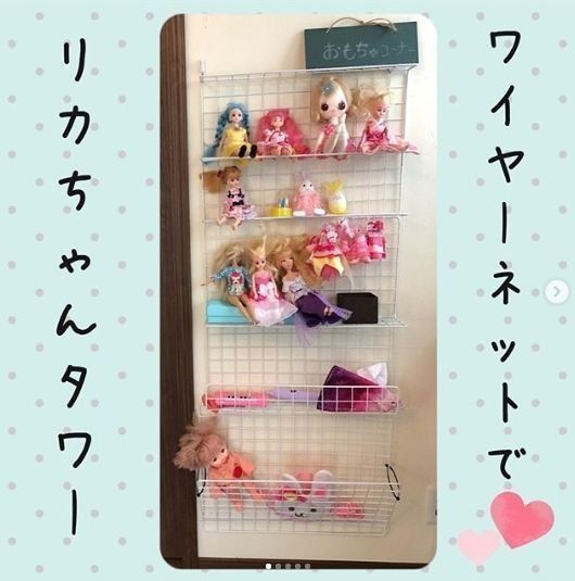 かわいい人形は箱にしまってしまうと、なんだかかわいそうな気もしてしまいますよね。できれば見えるところに置いておきたいものです。こちらはたくさんある人形を、100均のワイヤーネットと結束バンドで見える収納をつくった例。お人形のタワーができて子どもも喜びそうですね。