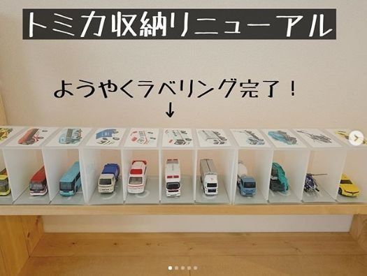 こちらのミニカーの収納はまるで本物の車庫のよう。ボックスには車の写真がラベリングされているので、どの車がどこに入るのかすぐにわかります。これなら、子どもも楽しみながら片づけることができますね。
