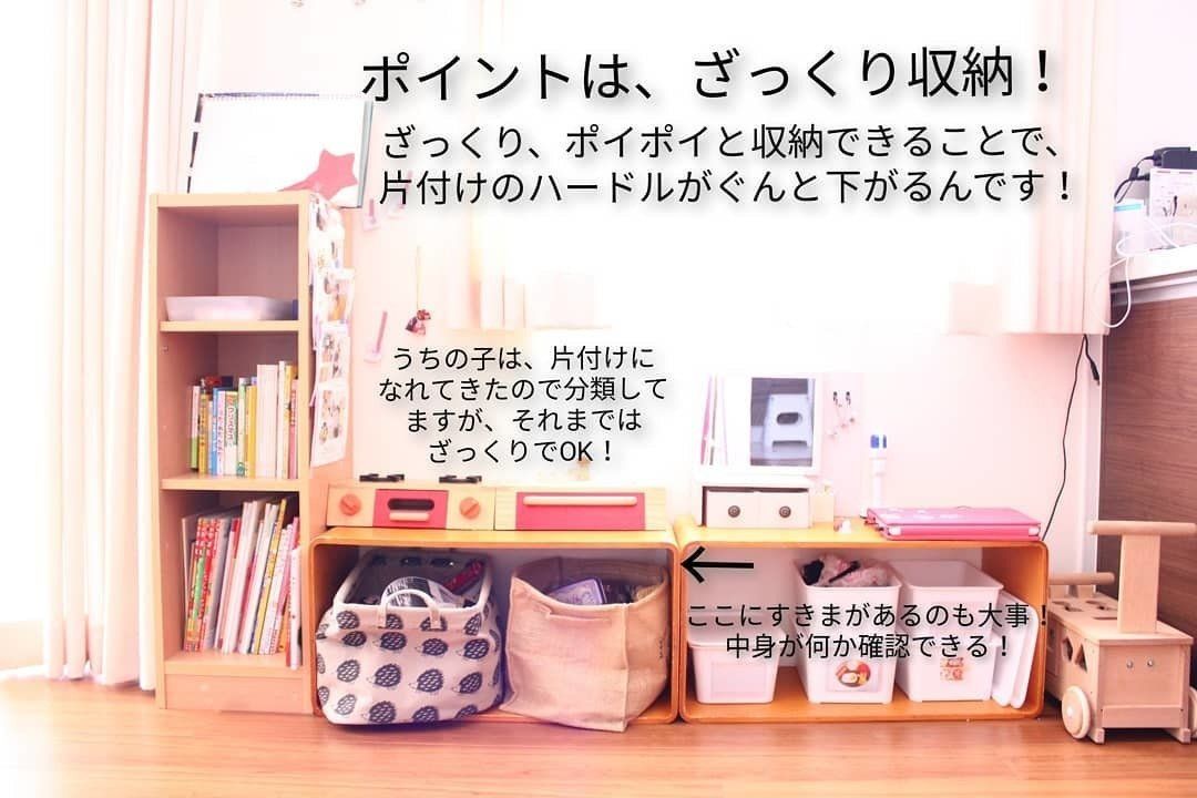 こまかく分類されたおもちゃ収納に憧れますが、あまり整理しすぎると片づけに時間がかかって面倒になってしまいがち。片づけのハードルを下げるためにも、ざっくり収納ができるスペースを確保しておくことがおすすめ。子どもが自分で片づけできるようになってきたら、少しずつ分類をはじめてみましょう!
