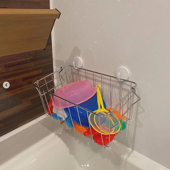 3COINSのワイヤーバスケットは軽い素材で網目も大き目なので水キレが抜群でお風呂のおもちゃ収納に便利です。多くのお風呂の壁はマグネットがつくので、マグネットフックを合わせれば簡単に壁面収納がつくれます。