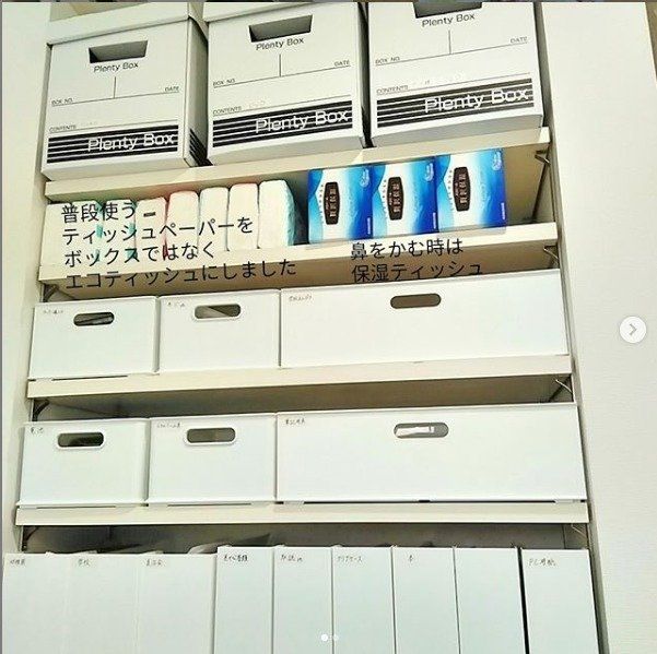使う頻度の少ないものは無印やニトリの収納アイテムですっきり収納させ、頻度の高いティッシュはすぐに取り出せるように見せる収納を実践されています。また、収納ボックスにはしっかりとラベリングがされているので、家族が「どこに何があるのかわからない」と困ることもありません。