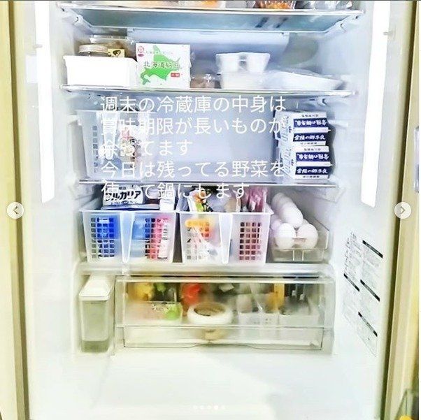 いつも綺麗に保ちたい冷蔵庫内は食材が少なくなったタイミングで掃除をこまめにしているというrinrinhana12さん。取っ手つきの100均カゴにあらかじめ食材を入れておけば、掃除の際もさっと取り出してすぐに元にもどせるので便利です。