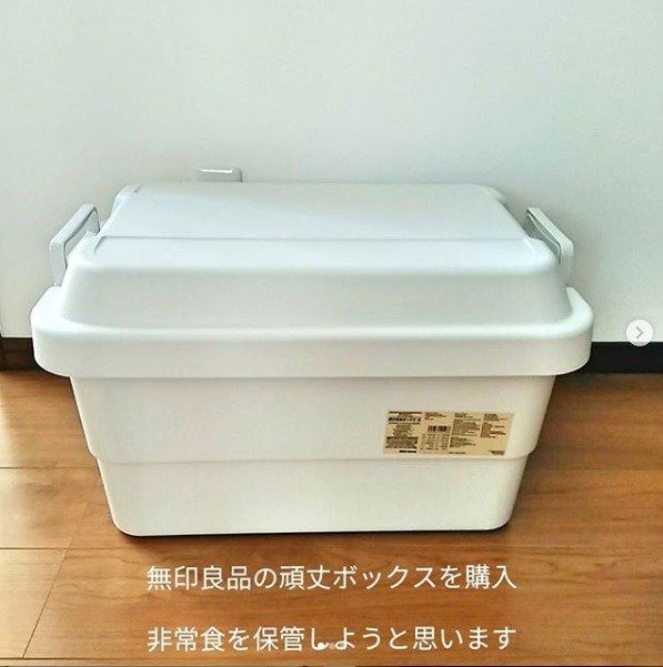 いざというときのための防災用品や非常食ストックは、無印の頑丈ボックスにひとまとめにしておくのがおすすめ。無印の収納ボックスはサイズもいろいろあるだけでなく、蓋の上に座れちゃうほど頑丈なので防災用品収納にうってつけです。