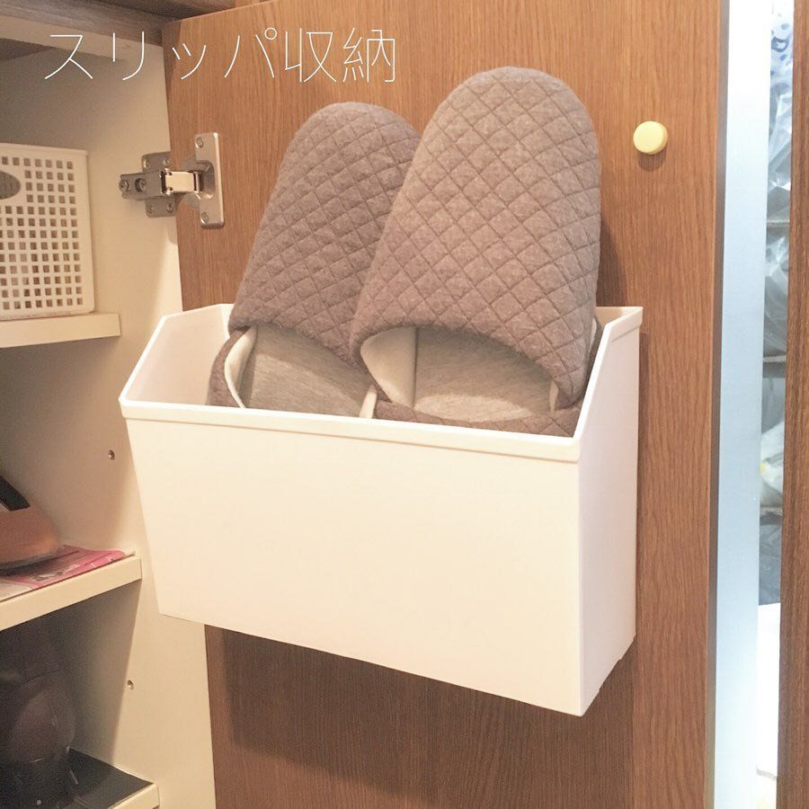 床にものを置かない生活をしているaya.monoさん。100円ショップのはがせるシートフックにこちらも100均のケースを引っ掛けてスリッパの収納場所をつくりました。吸盤補助板をつけて強度をアップし、落下しない工夫もしています。