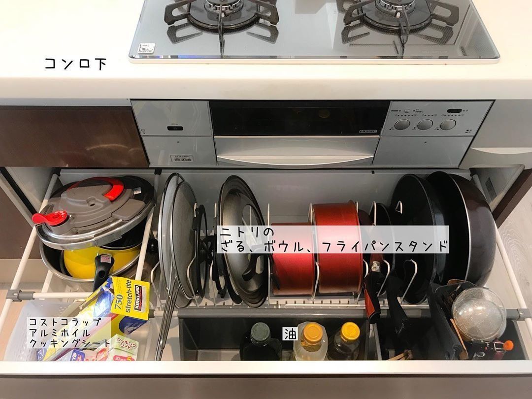 nonsuke__さんはコンロ下の収納をニトリのファイルボックスからスタンドに変更しました。スタンドタイプにしたことで、フライパンや鍋、フタがワンクッションで取り出せて快適に!ラップ類もおなじ場所にたてて収納しています。
