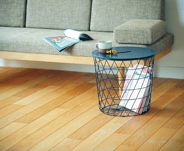ふたを閉めればコーヒーテーブルとしても使える、大きなワイヤーかご。読みかけの雑誌やブランケットなど、ソファまわりで使う物をたっぷりと収納できます。