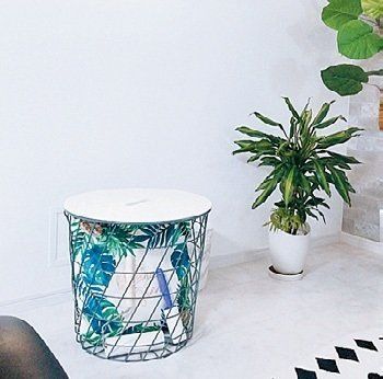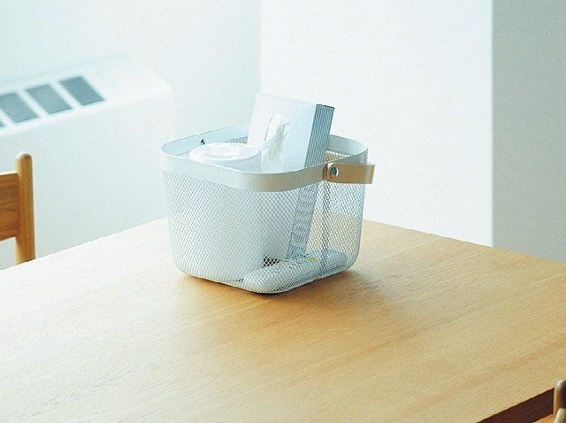 ティッシュやリモコンなど、テーブルまわりに散乱しがちなアイテムは、かごにまとめるだけでスッキリ整った印象に。木製ハンドルつきのメッシュかごなら移動がしやすいうえ、出しっ放しでも絵になります。