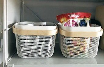 通気性がいいので、べんとうグッズや朝食セットなどの食材を収納するのに最適。角形で、棚にぴったり納まるのもうれしいところ。