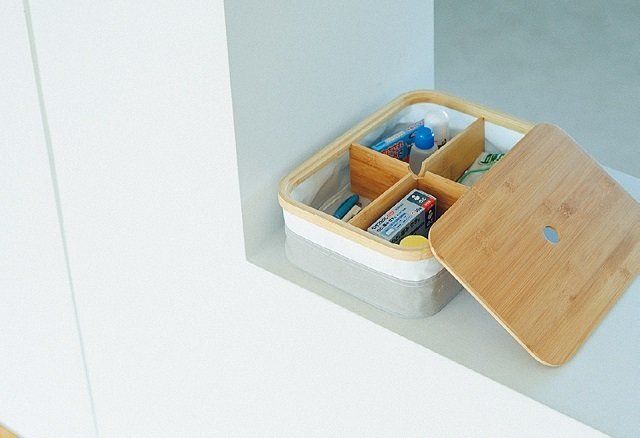 竹製のふたがついた布製ボックス。仕切りつきだから、薬や充電器など、用途がバラバラでも1つのボックスに収納できます。ゴチャつきがちなカウンターの上やテーブルまわりも、これ1つで一気に解決!