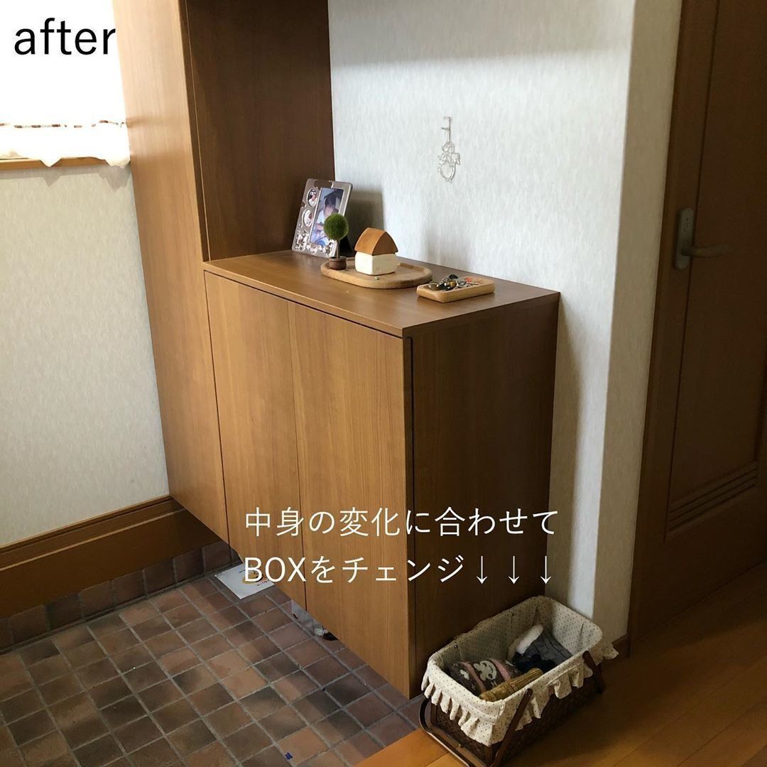 ruchan253さんは、玄関わきにカゴの収納ボックスを置いています。子どもの登校時に必要な手袋などを入れているのだとか。以前は、幼稚園への送迎に使う自転車用品が入るサイズのカゴを置いていたそうですが、子どもの成長に合わせて小さめのカゴに交換したそうです。どこかに置き忘れる心配もへり、見た目もスッキリですね!