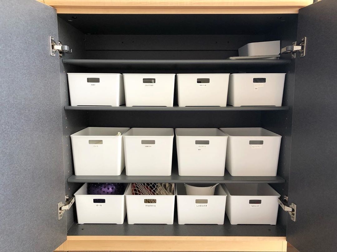 mi.homeさんは、玄関の収納棚の1つを白いボックスでしきつめ、外で使うものの収納ゾーンに。ボックスにはラベルがはってあり、見た目も分かりやすい収納となっています。取っ手つきのボックスにしたので、子どもも使いやすいそう。スッキリ感と分かりやすさ両方を手にいれた収納、参考にしたいですね。