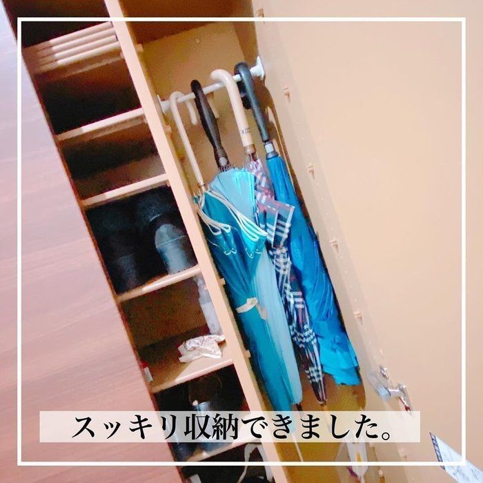 kasumi_mixさんは、靴を収納している棚の横にある、スリムな空間も最大限使いたい!と、傘を収納することに。つっぱり棒を使っての収納を考え、棒の圧力や色うつりから壁を守るガード部品を使用しました。棒を受ける部品もついているので、つっぱることなく使用でき便利なのだとか。無事に傘を収納できました。