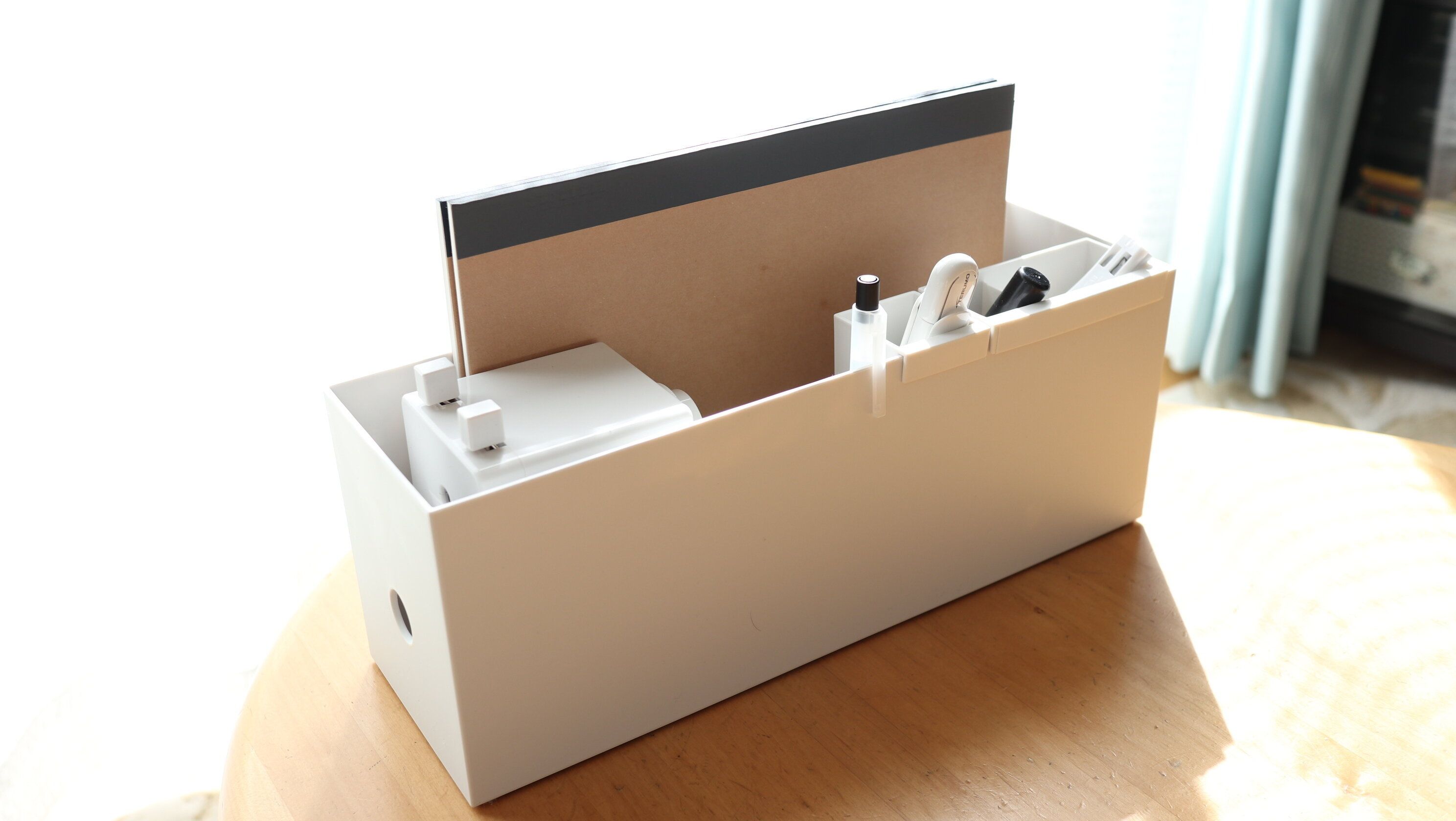 毎日、リビングテーブルに出しっぱなしにして、スムーズにおしたくが進むようにしています。我が家の子供達は書くことが大好きなので、ノートを収納したりも。