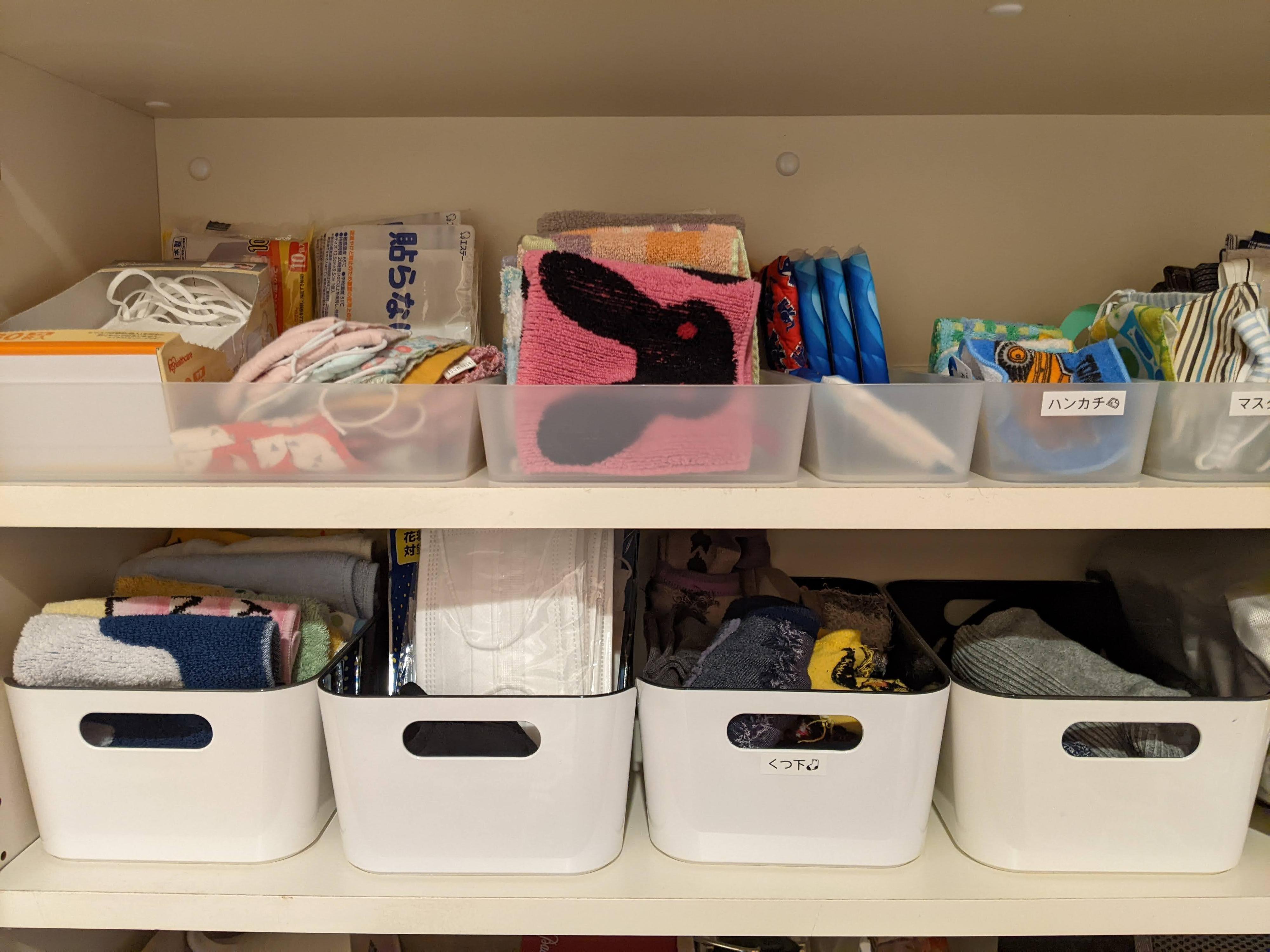 我が家では、玄関で靴下を履く夫と息子のために、棚の中に靴下の収納場所を確保。娘はカイロを持って出かけることが多いので、娘のマスクと一緒にカイロも置いています。