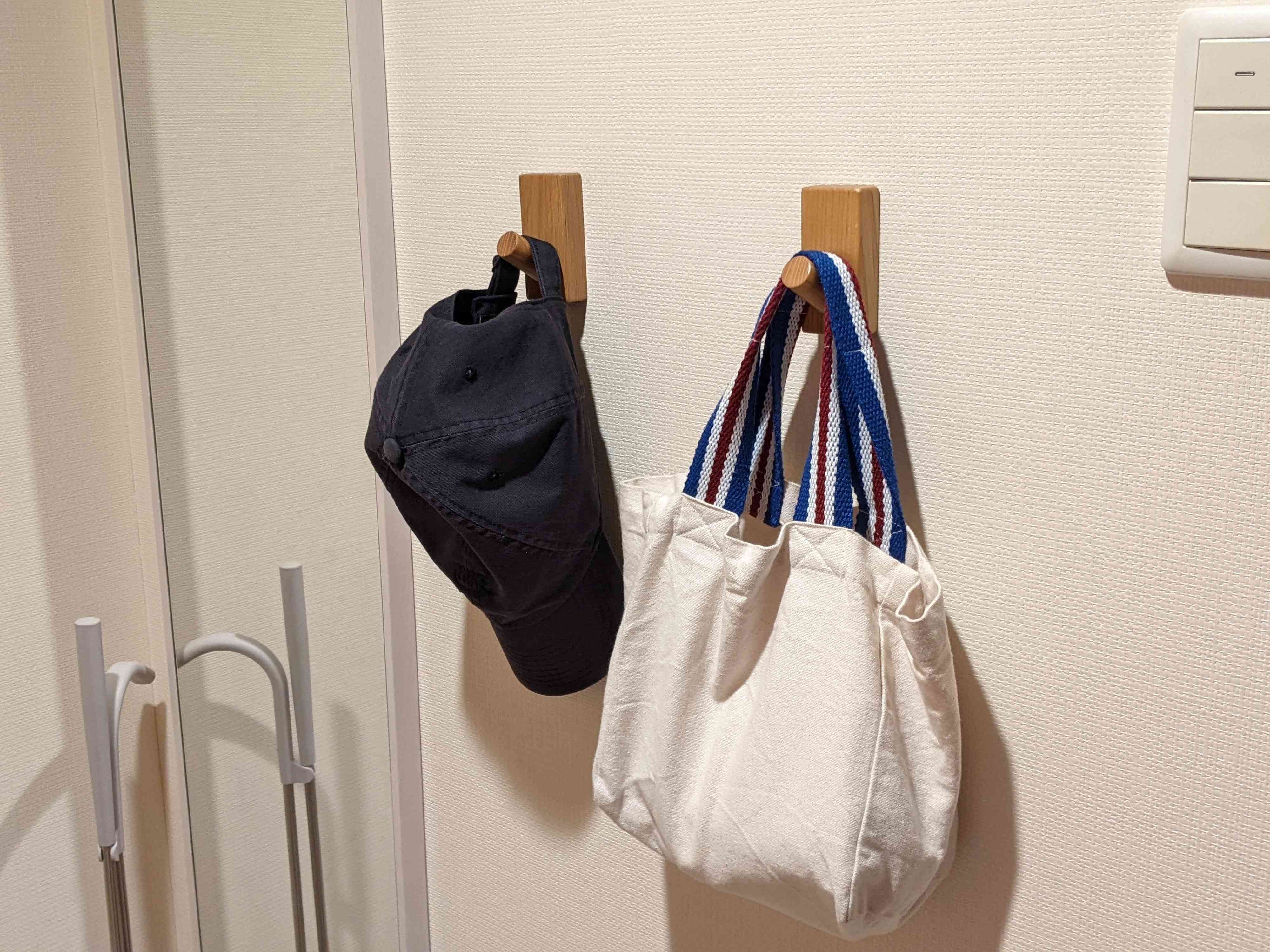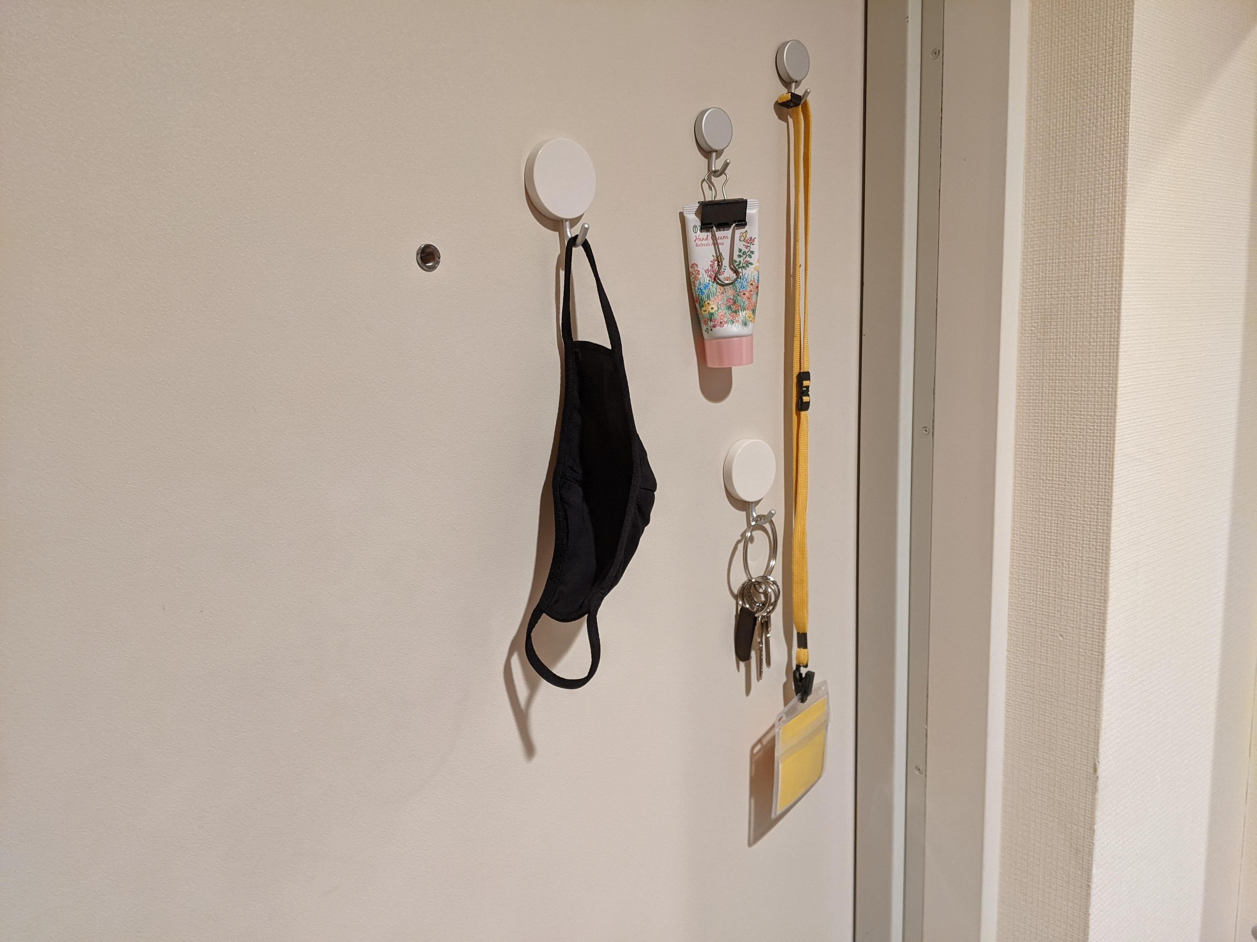 特に玄関ドアの裏は出かけるときに必ず目線がいくので、忘れがちなものや出かける直前に使用するものをかけるとよいでしょう。