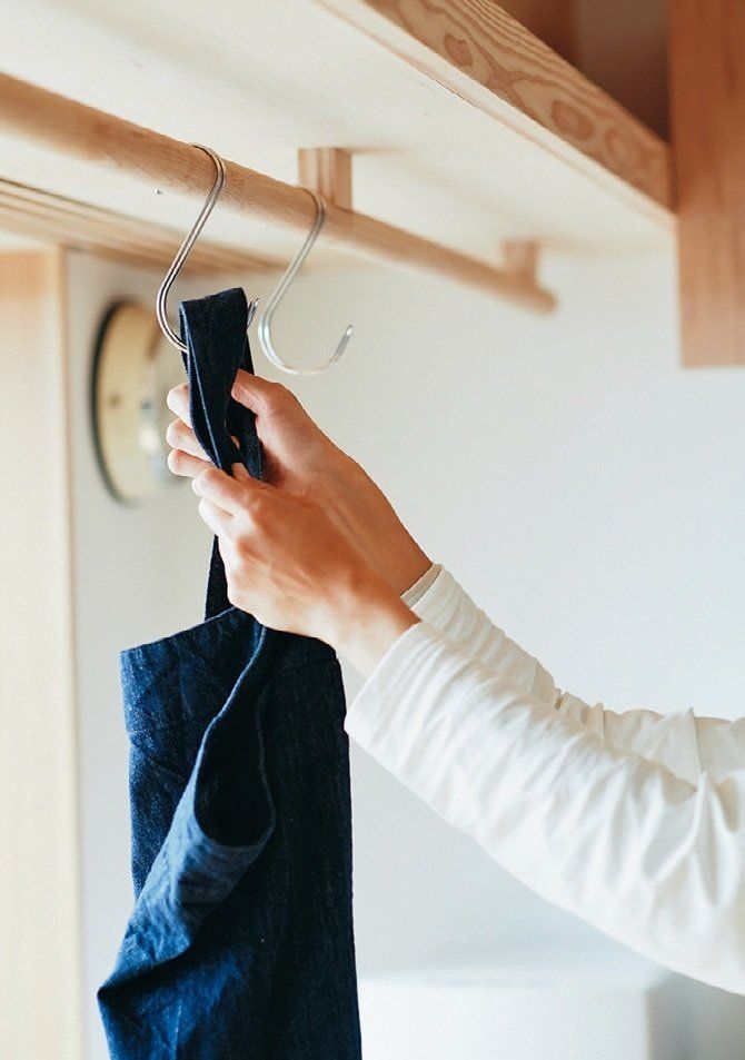 キッチンわきのポールにフックをつけて、エプロンの一時掛けに。「適度な幅でエプロンを掛けやすく、取るときはフックがブレません。ブレないからさっと取れます」。